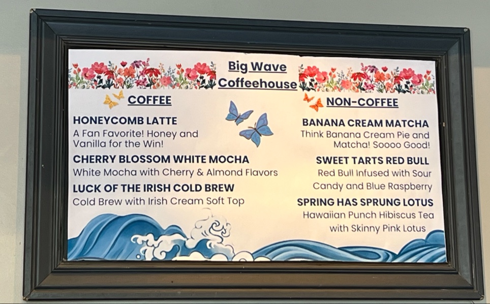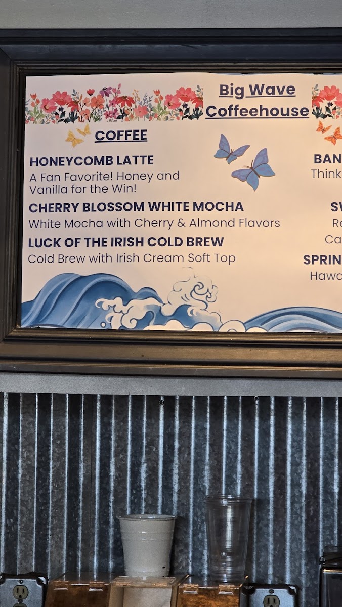 From a reviewer’s perspective, the menu at Big Wave Coffeehouse delivers a well-rounded and comforting experience that neatly ties together quality, creativity, and everyday appeal. Their breakfast selection focuses on familiar favorites done right, with options like Avocado Toast, English Muffin Sandwich, Bagel Sandwich, Breakfast Burrito, and Croissant Sandwich, all of which feel thoughtfully chosen to satisfy both quick morning stops and relaxed brunch visits. These items balance simplicity and flavor, making the menu approachable without feeling basic. Complementing the food is a standout lineup of specialty blended drinks that adds a playful, indulgent edge to the coffeehouse experience. Choices such as Cookies & Cream, Blended Mocha, Mocha Java Rush, Peanut Butter Banana Mocha, and Mint Chip Mocha highlight the café’s ability to cater to guests who enjoy dessert-like beverages alongside classic coffee flavors. As a whole, the menu feels cohesive and purposeful, offering enough variety to please different tastes while staying true to the cozy, welcoming identity of a neighborhood coffeehouse. This thoughtful combination of satisfying breakfast dishes and creative blended drinks leaves a strong final impression, reinforcing Big Wave Coffeehouse as a reliable and enjoyable spot for both food and coffee lovers in Folsom.